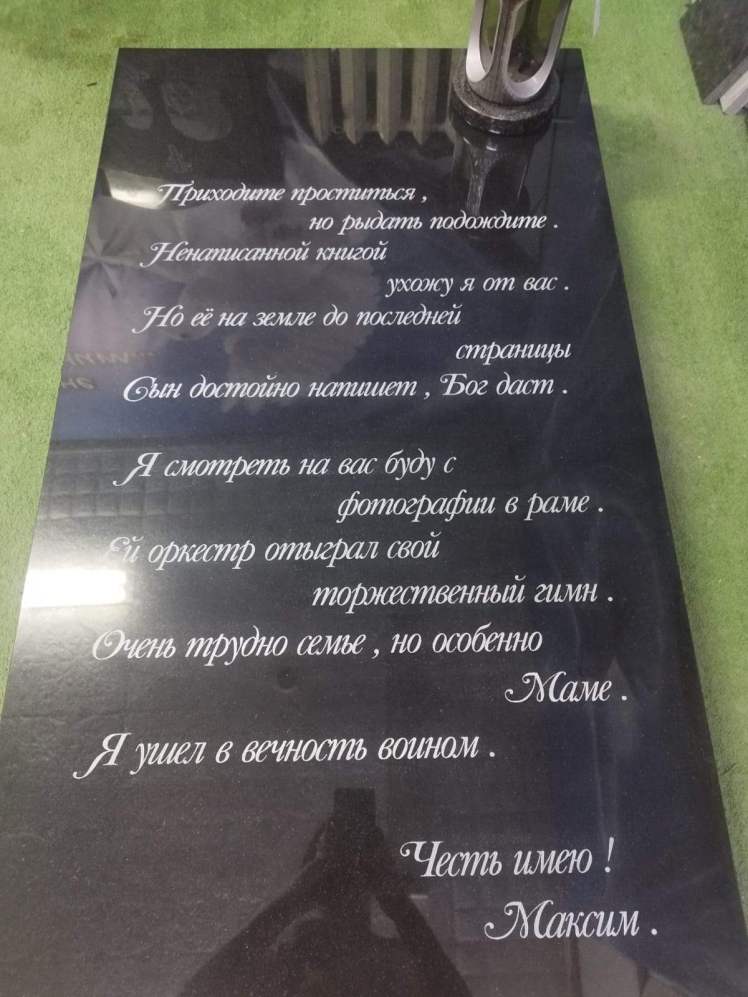 Выполнение гравировки и нанесение изображения происходит в точном соответствии с пожеланиями заказчика. Надписи и изображения наносятся посредством использования специального оборудования, которым оснащена наша мастерская по изготовлению памятников. Для нас нет неразрешимых задач, любой узор, эпитафия, которую желает видеть на надгробии заказчик, будет исполнена.